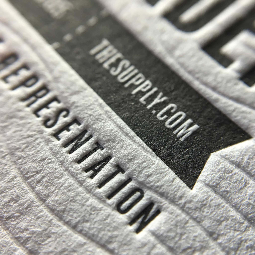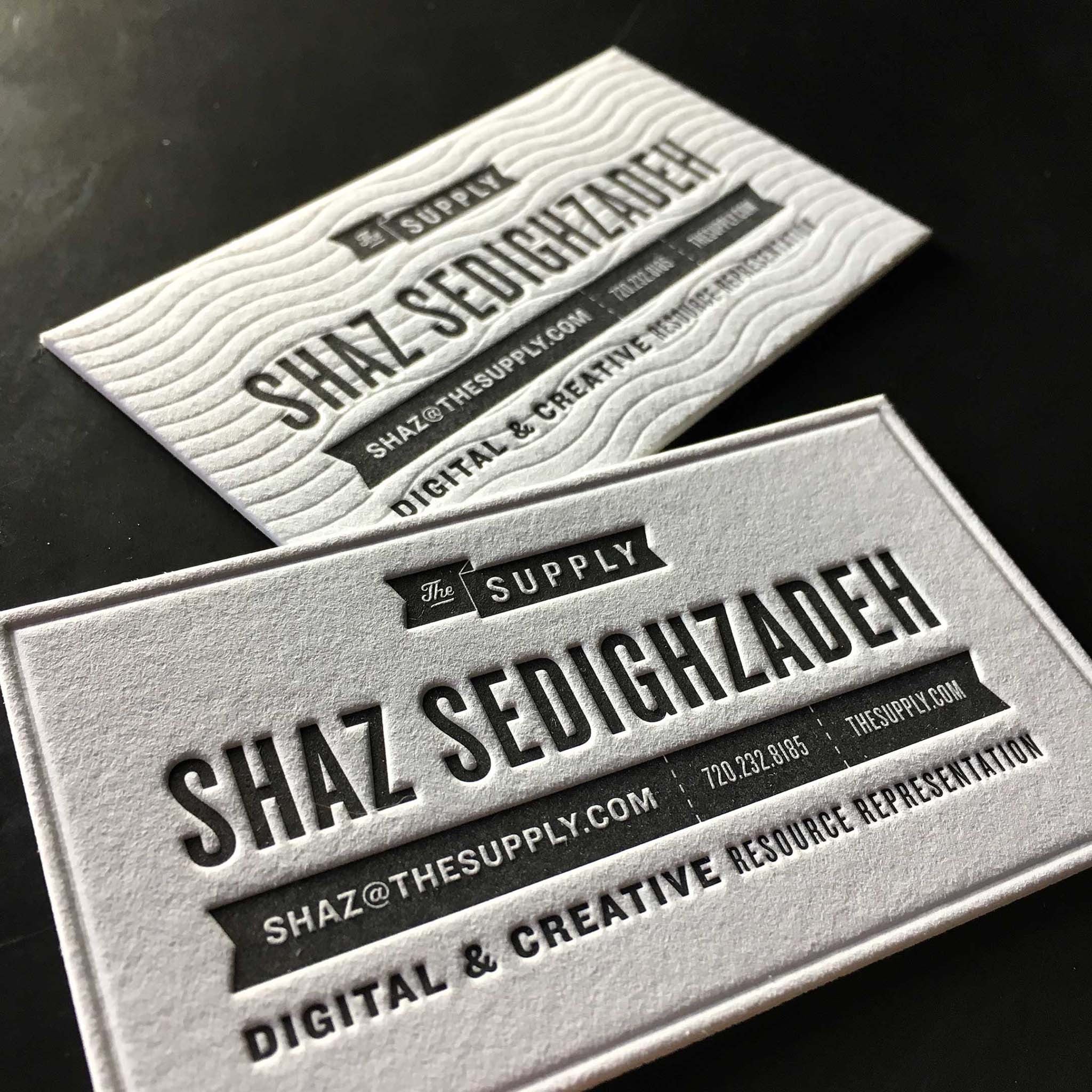 To create 2 versions of this business card we first Letterpress printed the same contact information in black ink. We then used 2 different printing plates to create the border design and wave design utilizing a Blind Impression technique (no ink).