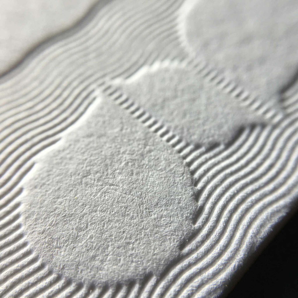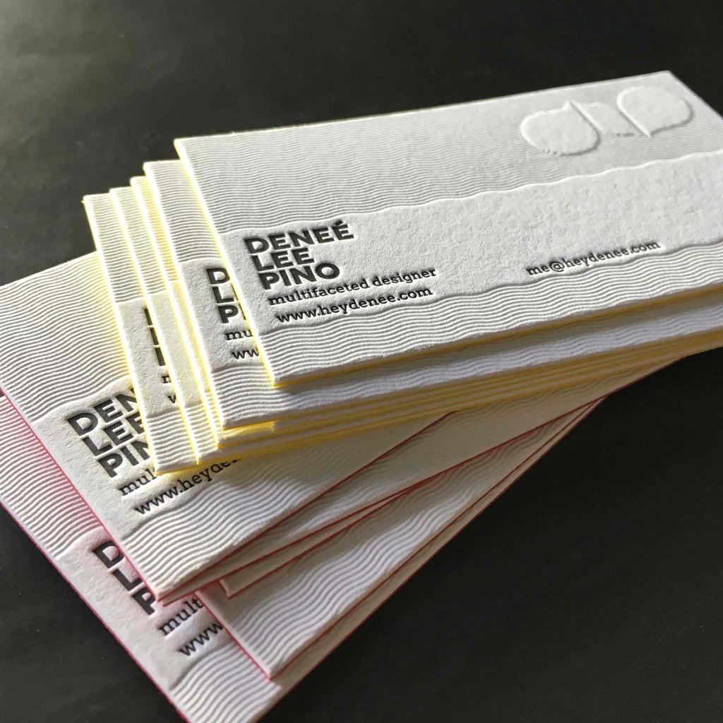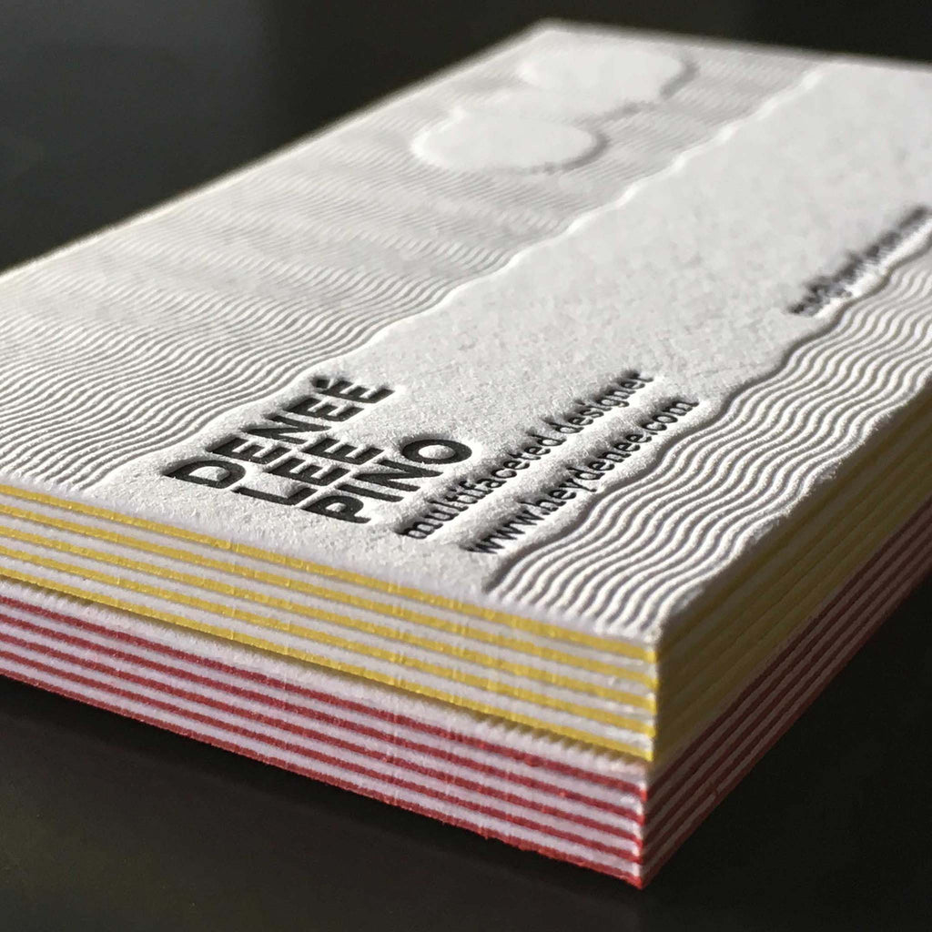 Duplexing (gluing 2 or more sheets of paper) is a great way to add color without the higher costs of printing. Combining this technique with a blind impression (letterpress print without ink) really creates a stand out business card.