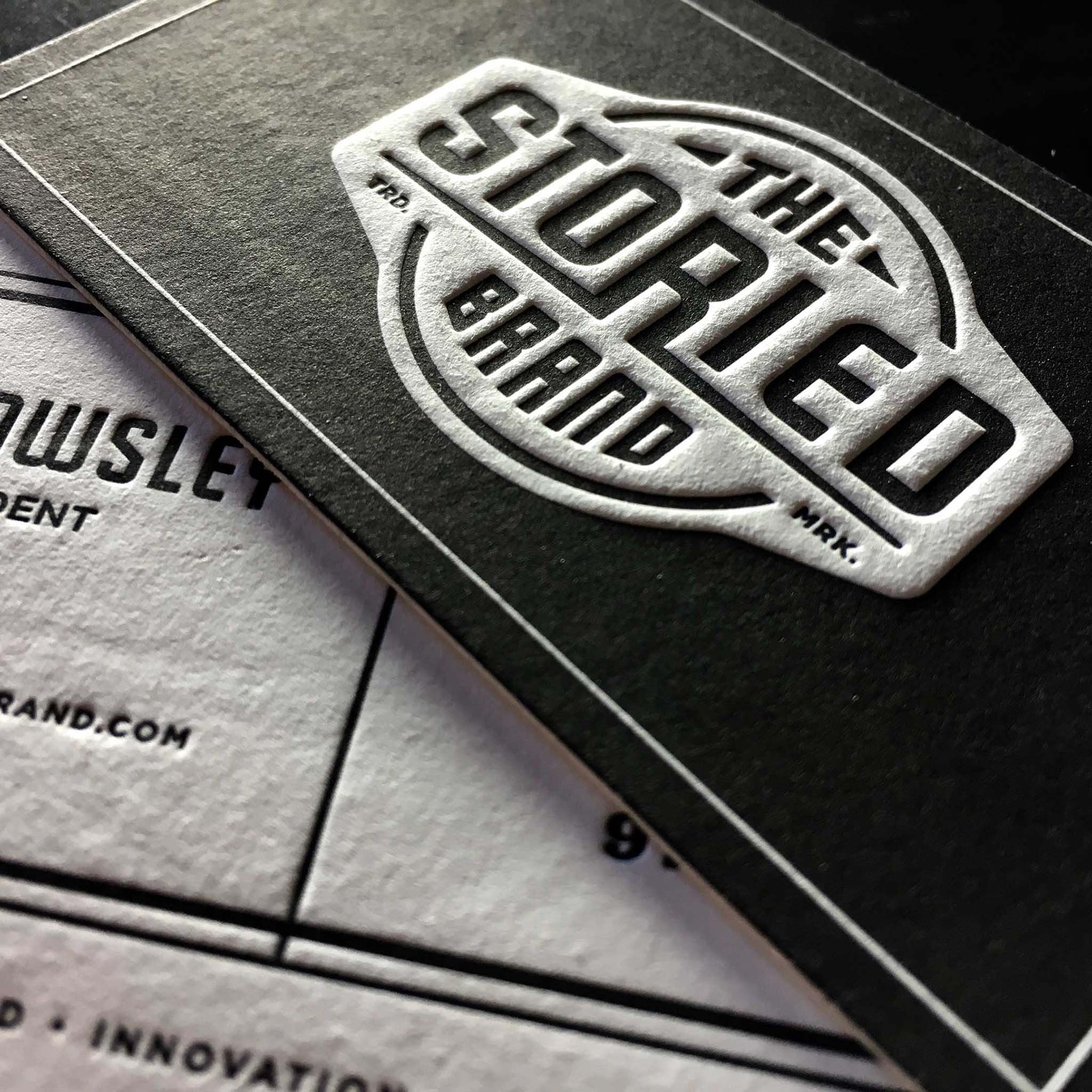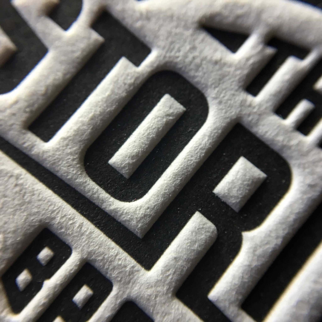 Using very heavy pressure we letterpress printed with a solid flood of black ink to create a faux emboss look compressing the soft cotton paper. Ink modification and special plate preparation is needed to print small typography with this reverse print technique.