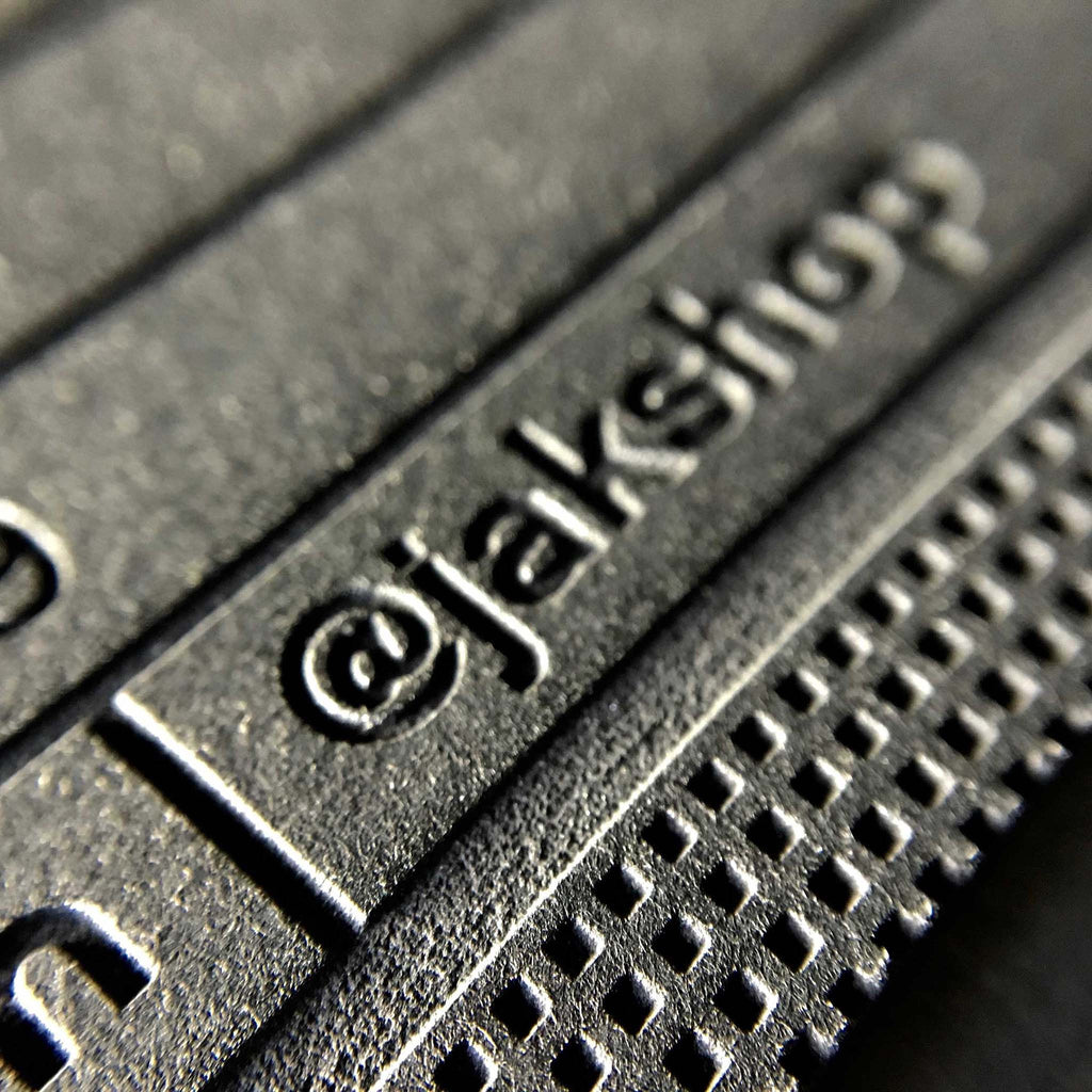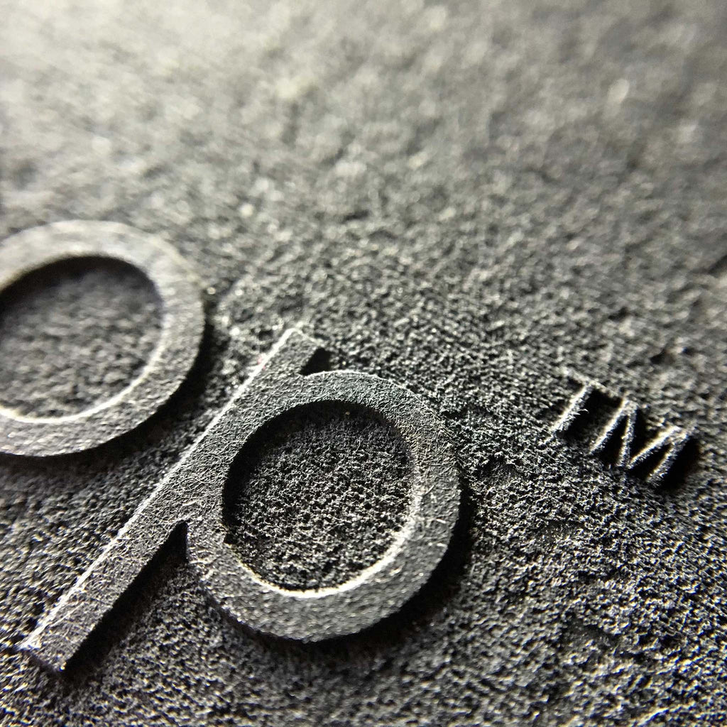 To create the embossed style of the logo a revolutionary laser engraving technique was developed to remove the surrounding paper leaving a raised logo design. The laser engraving on the raised logo side created a soft, velvet texture.