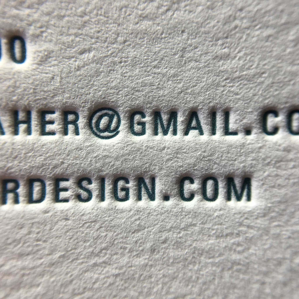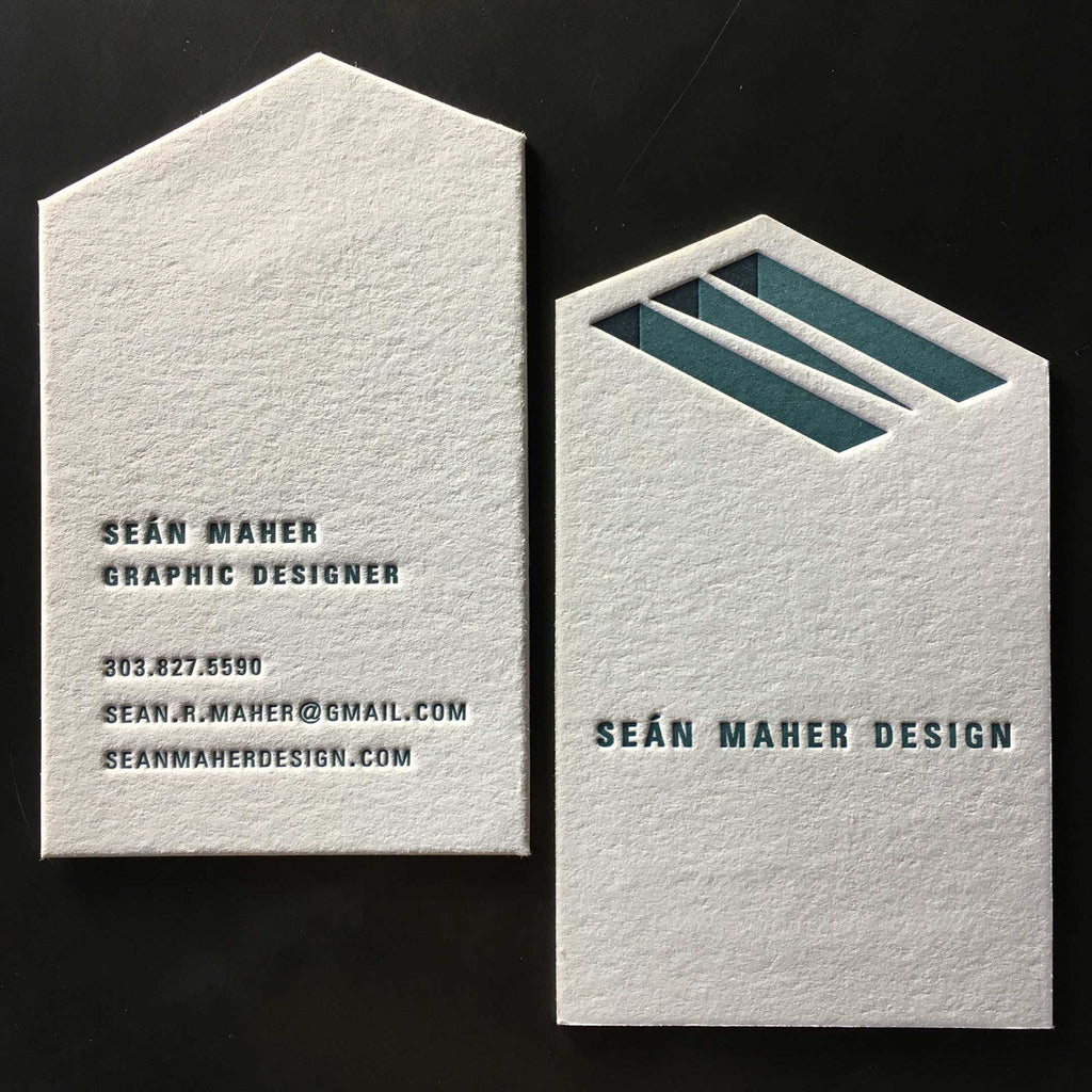 A custom Die Cut was used to match the 3 Dimensional effect of the "M" logo at the top of the business card. Overprinting with dark blue ink was used to give the "M" logo a shadow appearance.