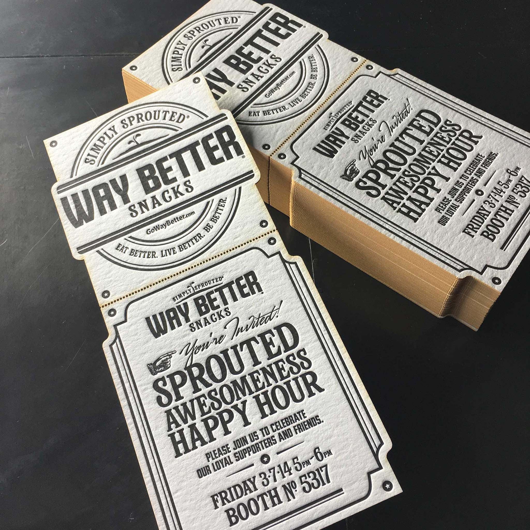 A Letterpress printed invitation for a Minneapolis based Tortilla Chip Company. Using Laser Cutting we are able to create a unique card shape without the use of a traditional Die Cut which requires a custom steel rule die. This technique is especially useful on smaller print runs.