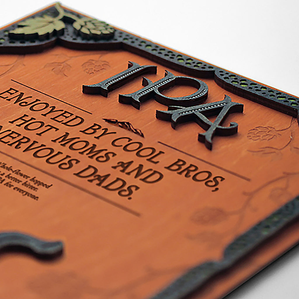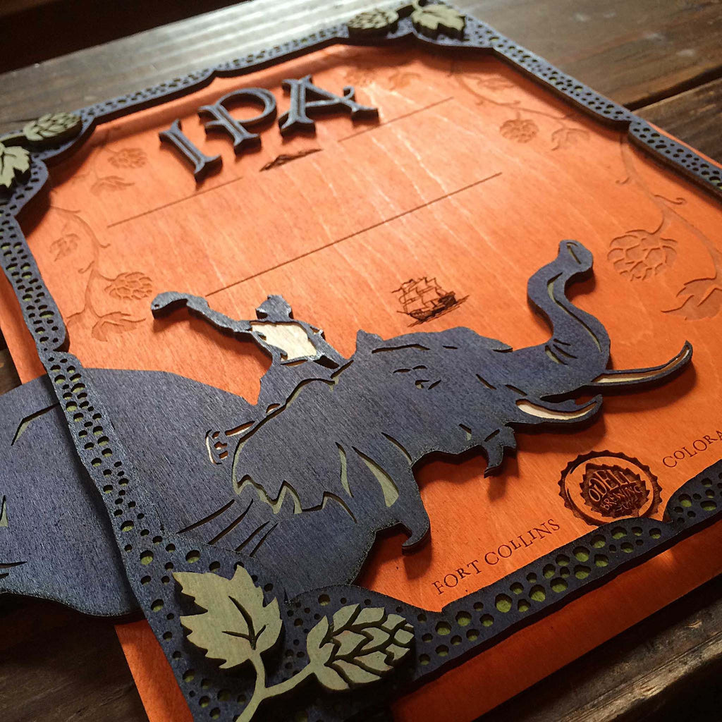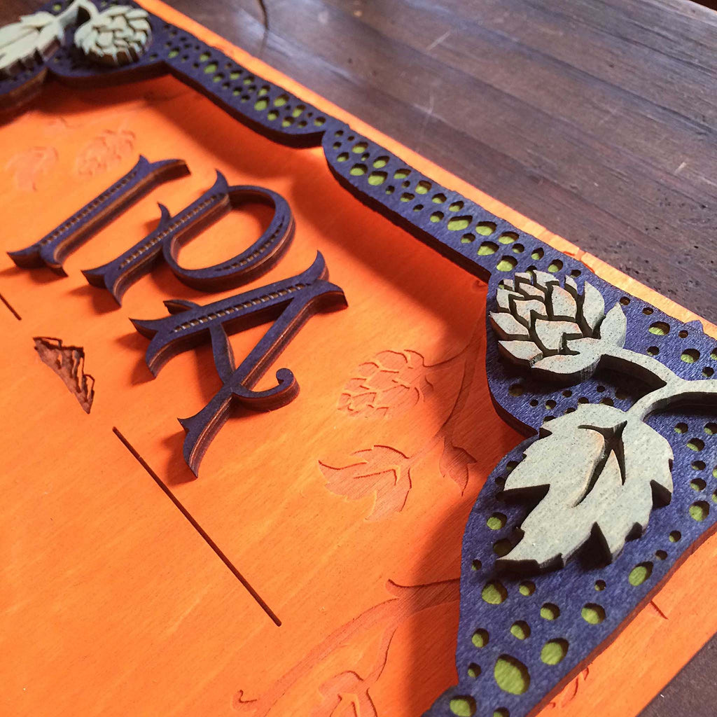 A 3-Dimensional Advertisement for Odell Brewing using multiple layers of stained wood that was laser cut and laser engraved with several different messages giving a unique, one-of-a-kind handmade feel.