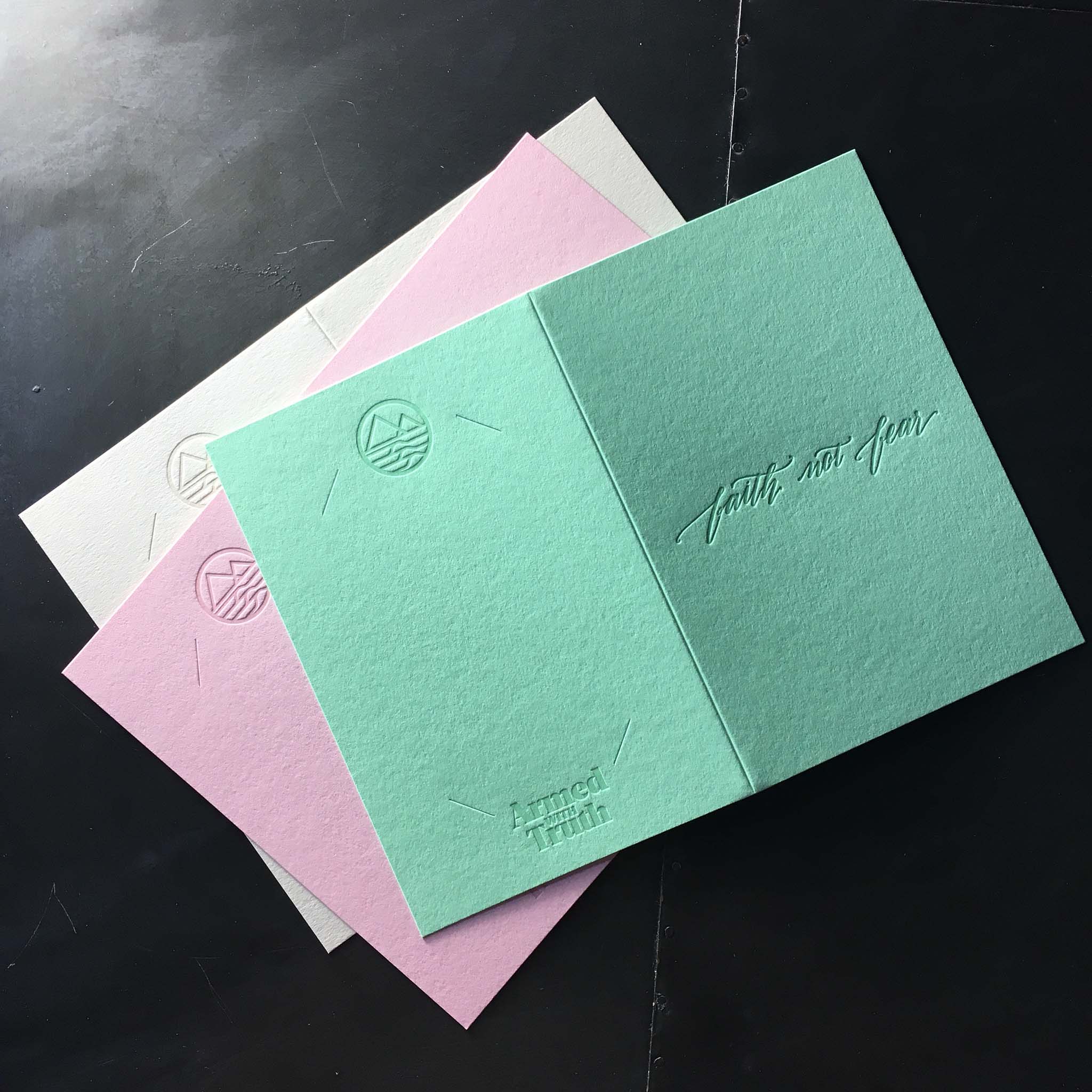 These pastel letterpress printed cards are designed to hold a faith-based temporary tattoo in the die cut tabs. These were letterpress scored for easy folding without tearing. Subtle varnish ink is used for the logo and messaging.