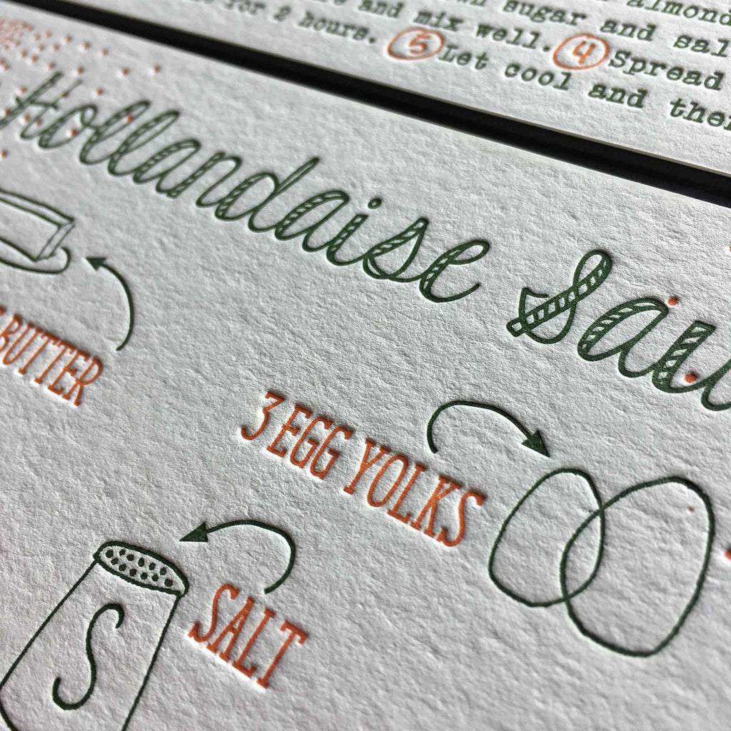 Showcasing seasonal holiday recipes with these letterpress printed cards. These thick cotton cards were printed double sided with a hole punch and matching orange string tie. These were used a gift idea for The Brown Palace Hotel in Denver.