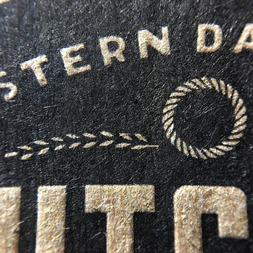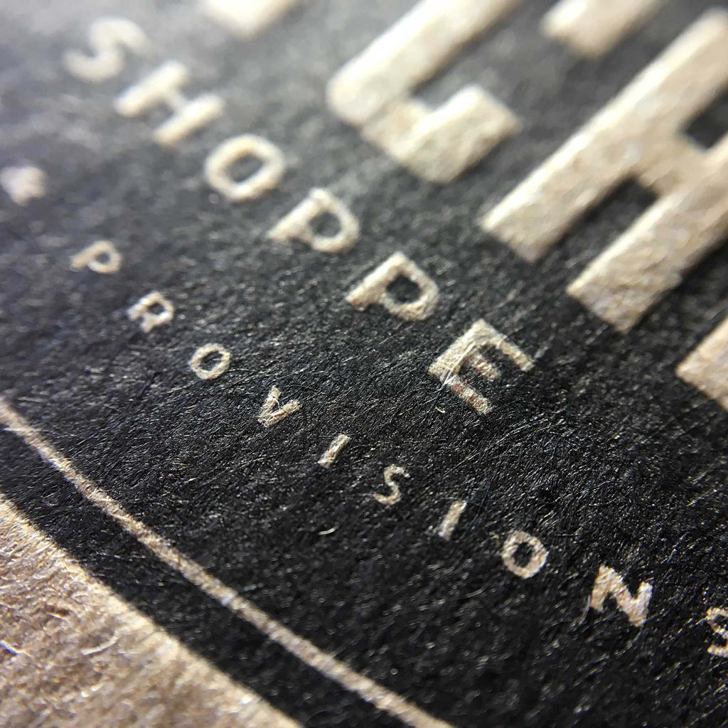 Recycled Kraft Paper with Letterpress Printed Black Logo on the front of these Business Cards for Highlands Denver Butcher Shoppe. Rubber Stamps were created for employees to stamp their individual contact information on the back of the cards.