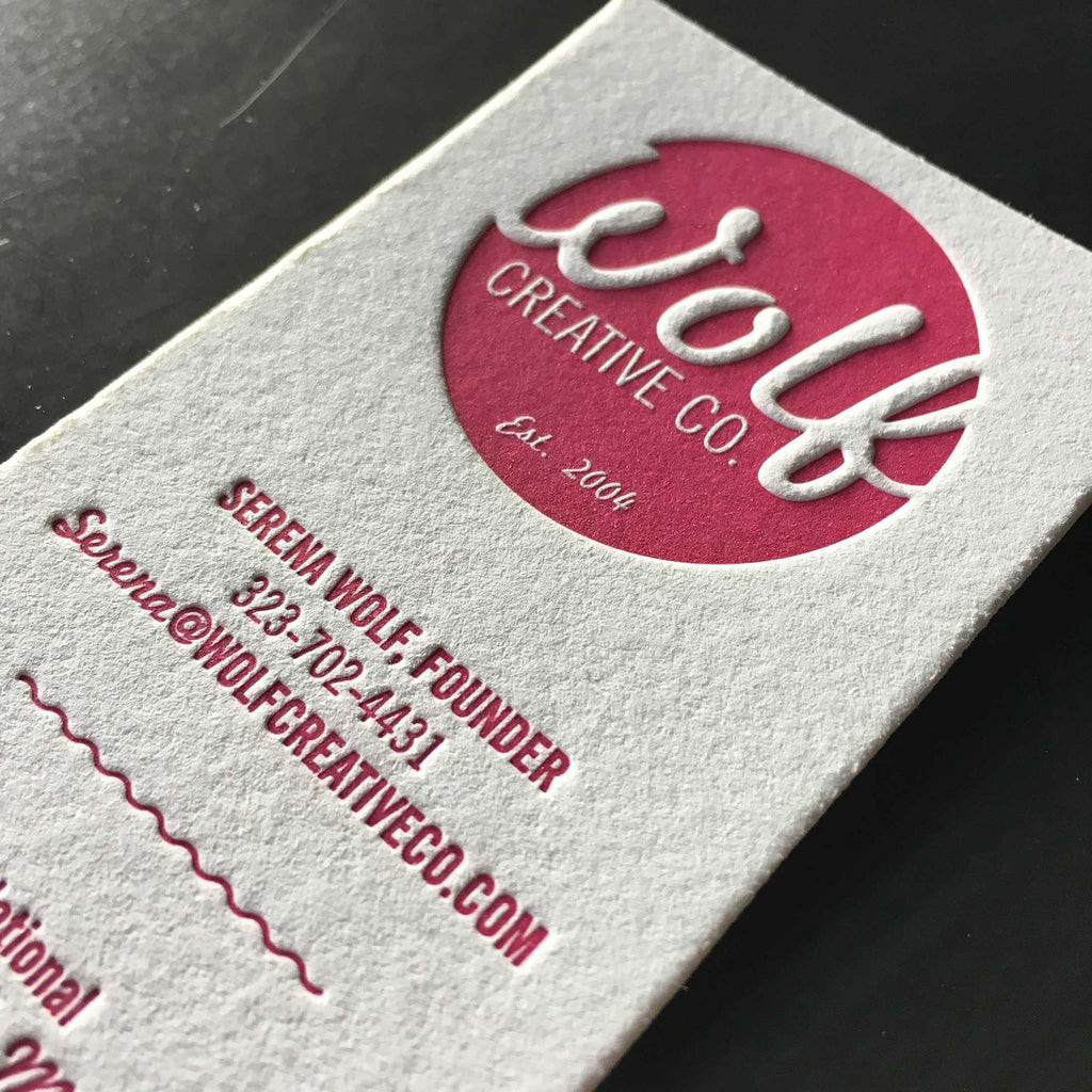 These vertical business cards were letterpress printed on a soft cotton paper with a bright pink ink. The deep impression in the top section of the card creates a raised logo effect.